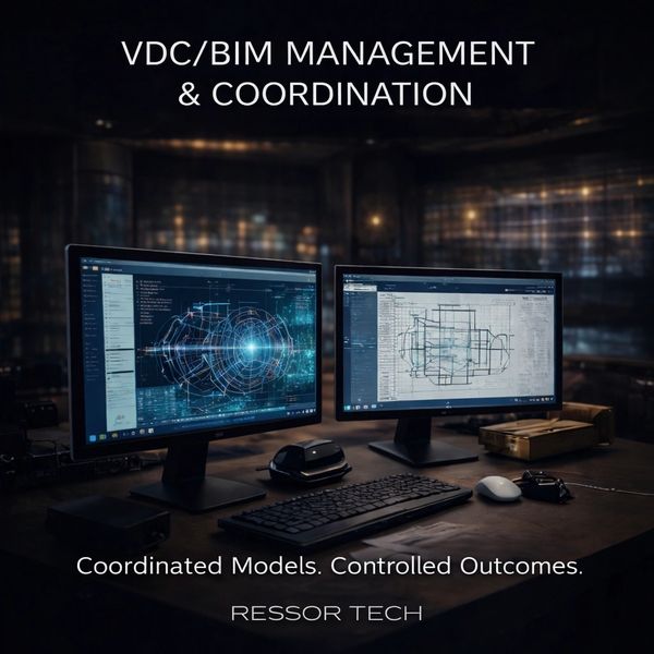 Ressor Tech provides comprehensive Virtual Design and Construction (VDC) and BIM management services that bring structure, clarity, and accountability to complex construction projects. We support projects of any size and can engage at any stage — from early design through fabrication and installation.